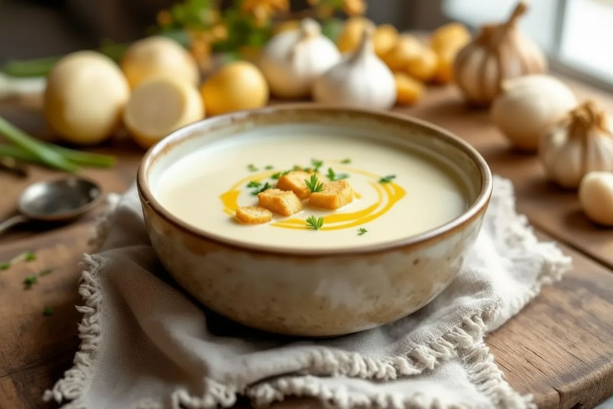 Lorsque le froid s’invite, rien ne vaut une soupe réconfortante. Ce velouté blanc marie parfaitement le poireau, l’oignon, le navet, la pomme de terre et l’ail confit pour créer une texture étonnamment douce et apaisante. Grâce à des ingrédients simples et accessibles, cette soupe est une alliée contre les frimas de l’hiver.