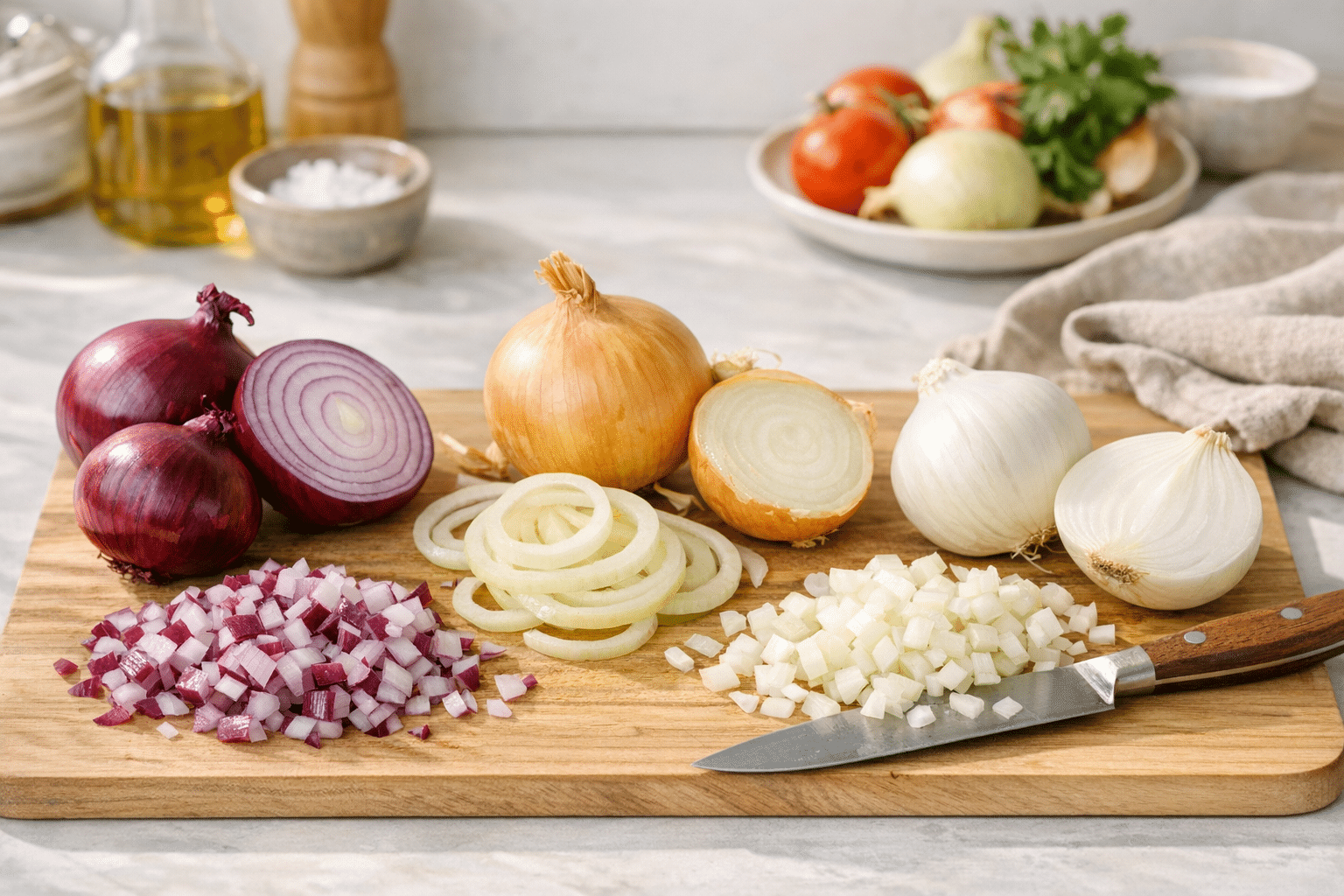 On recense des dizaines de variétés d’oignons dans le monde, mais en cuisine du quotidien, trois familles dominent : l’oignon rouge, l’oignon blanc et l’oignon jaune. Visuellement, ils se distinguent en un coup d’œil, mais leurs différences vont bien au-delà de la couleur.